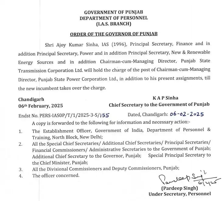ਪੰਜਾਬ ਸਰਕਾਰ ਨੇ ਸ਼੍ਰੀ ਅਜੋਇ ਕੁਮਾਰ ਸਿਨਹਾ ਨੂੰ ਵੱਡਾ ਜ਼ਿੰਮੇਵਾਰ ਅਹੁਦਾ ਸੌਂਪਦਿਆਂ, ਪੰਜਾਬ ਸਟੇਟ ਪਾਵਰ ਕਾਰਪੋਰੇਸ਼ਨ ਲਿਮਿਟੇਡ ਦਾ ਚੇਅਰਮੈਨ ਅਤੇ ਮੈਨੇਜਿੰਗ ਡਾਇਰੈਕਟਰ ਬਣਾਇਆ ਹੈ। ਉਹ ਇਸ ਨਾਲ ਨਾਲ ਵਿੱਤ, ਪਾਵਰ ਅਤੇ ਨਵੀਕਰਣਯੋਗ ਊਰਜਾ ਦੇ ਪ੍ਰਿੰਸੀਪਲ ਸਕੱਤਰ ਦੇ ਤੌਰ ‘ਤੇ ਵੀ ਕਾਰਜਸ਼ੀਲ ਰਹਿਣਗੇ।