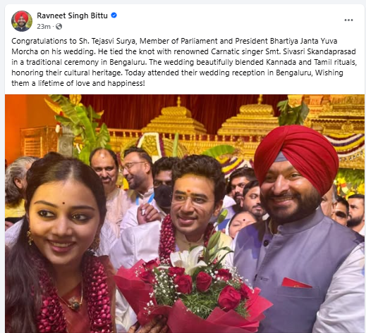 ਤੇਜਸਵੀ ਸੂਰਿਆ ਦਾ ਵਿਆਹ ਕਰਨਾਟਿਕ ਗਾਇਕਾ ਸਿਵਾਸਰੀ ਸਕੰਦਪਰਸਾਦ ਨਾਲ ਬੈਂਗਲੁਰੂ ‘ਚ ਸੰਪੰਨ