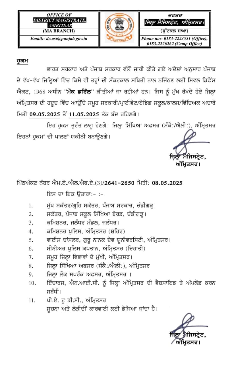 ਅੰਮ੍ਰਿਤਸਰ ਵਿਖੇ 9 ਤੋਂ 11 ਮਈ 2025 ਤੱਕ ਨਕਲ ਭੰਨਣ ਲਈ ਸੈਕਸ਼ਨ 144 ਲਾਗੂ, ਵਿਸ਼ੇਸ਼ ਅਹਿਦਾਇਤਾਂ ਜਾਰੀ