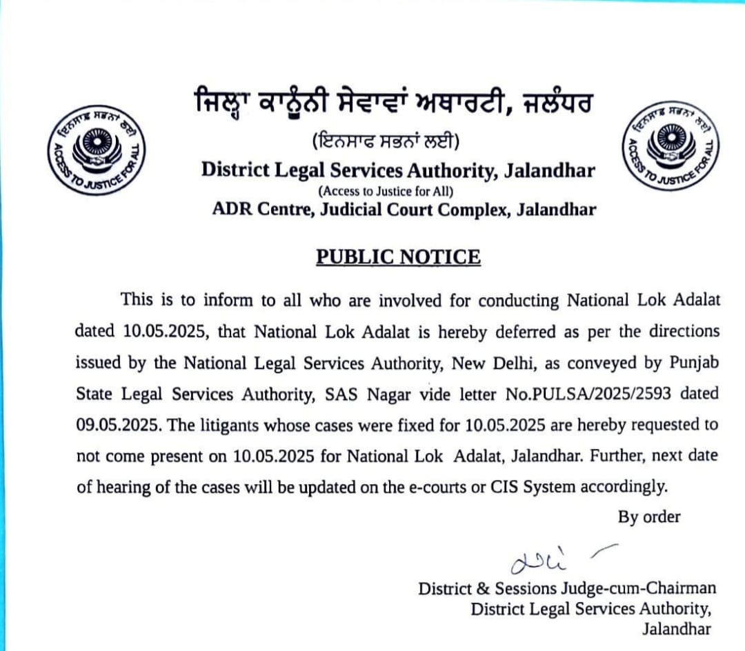 ਜਿਲ੍ਹਾ ਅਤੇ ਸੈਸ਼ਨਜ਼ ਜੱਜ ਜਲੰਧਰ ਸ੍ਰੀ ਨਿਰਭਉ ਸਿੰਘ ਗਿੱਲ ਨੇ ਦੱਸਿਆ ਕਿ 10 ਮਈ 2025 ਨੂੰ ਲੱਗਣ ਵਾਲੀ ਰਾਸ਼ਟਰੀ ਲੋਕ ਅਦਾਲਤ ਨੂੰ ਰਾਸ਼ਟਰੀ ਕਾਨੂੰਨੀ ਸੇਵਾਵਾਂ ਅਥਾਰਟੀ, ਨਵੀਂ ਦਿੱਲੀ ਅਤੇ ਪੰਜਾਬ ਕਾਨੂੰਨੀ ਸੇਵਾਵਾਂ ਅਥਾਰਿਟੀ ਦੁਆਰਾ ਜਾਰੀ ਨਿਰਦੇਸ਼ਾਂ ਅਨੁਸਾਰ ਮੁਲਤਵੀ ਕਰ ਦਿੱਤਾ ਗਿਆ ਹੈ।