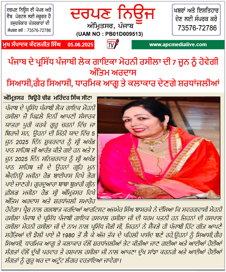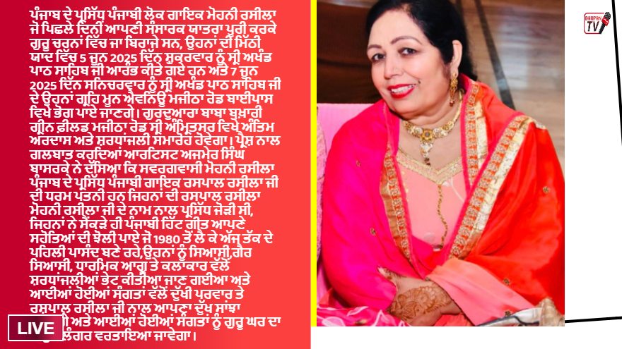 Home/State/Punjab/Amritsar/ਪੰਜਾਬ ਦੇ ਪ੍ਰਸਿੱਧ ਪੰਜਾਬੀ ਲੋਕ ਗਾਇਕਾ ਮੋਹਨੀ ਰਸੀਲਾ ਦੀ 7 ਜੂਨ ਨੂੰ ਹੋਵੇਗੀ ਅੰਤਿਮ ਅਰਦਾਸ AmritsarE-Paper Trending ਪੰਜਾਬ ਦੇ ਪ੍ਰਸਿੱਧ ਪੰਜਾਬੀ ਲੋਕ ਗਾਇਕਾ ਮੋਹਨੀ ਰਸੀਲਾ ਦੀ 7 ਜੂਨ ਨੂੰ ਹੋਵੇਗੀ ਅੰਤਿਮ ਅਰਦਾਸ ਸਿਆਸੀ,ਗੈਰ ਸਿਆਸੀ, ਧਾਰਮਿਕ ਆਗੂ ਤੇ ਕਲਾਕਾਰ ਦੇਣਗੇ ਸ਼ਰਧਾਂਜਲੀਆਂ Kanwaljit SinghJune 5, 2025 55 Less than a minute Kanwaljit SinghJune 5, 2025 55 Less than a minute Facebook Twitter LinkedIn Tumblr Pinterest Reddit VKontakte Share via Email Print