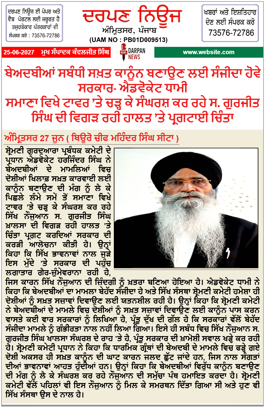 Home/State/Punjab/Amritsar/ਬੇਅਦਬੀਆਂ ਸਬੰਧੀ ਸਖ਼ਤ ਕਾਨੂੰਨ ਬਣਾਉਣ ਲਈ ਸੰਜੀਦਾ ਹੋਵੇ ਸਰਕਾਰ- ਐਡਵੋਕੇਟ ਧਾਮੀ Breaking NewsE-Paper ਬੇਅਦਬੀਆਂ ਸਬੰਧੀ ਸਖ਼ਤ ਕਾਨੂੰਨ ਬਣਾਉਣ ਲਈ ਸੰਜੀਦਾ ਹੋਵੇ ਸਰਕਾਰ- ਐਡਵੋਕੇਟ ਧਾਮੀ ਸਮਾਣਾ ਵਿਖੇ ਟਾਵਰ ’ਤੇ ਚੜ੍ਹ ਕੇ ਸੰਘਰਸ਼ ਕਰ ਰਹੇ ਸ. ਗੁਰਜੀਤ ਸਿੰਘ ਦੀ ਵਿਗੜ ਰਹੀ ਹਾਲਤ ’ਤੇ ਪ੍ਰਗਟਾਈ ਚਿੰਤਾ Kanwaljit SinghJune 27, 2025 12 Less than a minute Kanwaljit SinghJune 27, 2025 12 Less than a minute Facebook Twitter LinkedIn Tumblr Pinterest Reddit VKontakte Share via Email Print