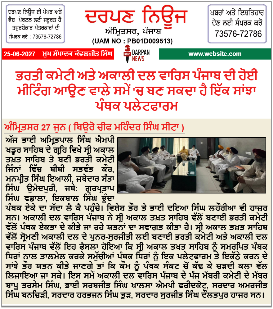 Home/State/Punjab/Amritsar/ਭਰਤੀ ਕਮੇਟੀ ਅਤੇ ਅਕਾਲੀ ਦਲ ਵਾਰਿਸ ਪੰਜਾਬ ਦੀ ਹੋਈ ਮੀਟਿੰਗ Breaking NewsE-Paper ਭਰਤੀ ਕਮੇਟੀ ਅਤੇ ਅਕਾਲੀ ਦਲ ਵਾਰਿਸ ਪੰਜਾਬ ਦੀ ਹੋਈ ਮੀਟਿੰਗ ਆਉਣ ਵਾਲੇ ਸਮੇਂ 'ਚ ਬਣ ਸਕਦਾ ਹੈ ਇੱਕ ਸਾਂਝਾ ਪੰਥਕ ਪਲੇਟਫਾਰਮ Kanwaljit SinghJune 27, 2025 16 Less than a minute Kanwaljit SinghJune 27, 2025 16 Less than a minute Facebook Twitter LinkedIn Tumblr Pinterest Reddit VKontakte Share via Email Print