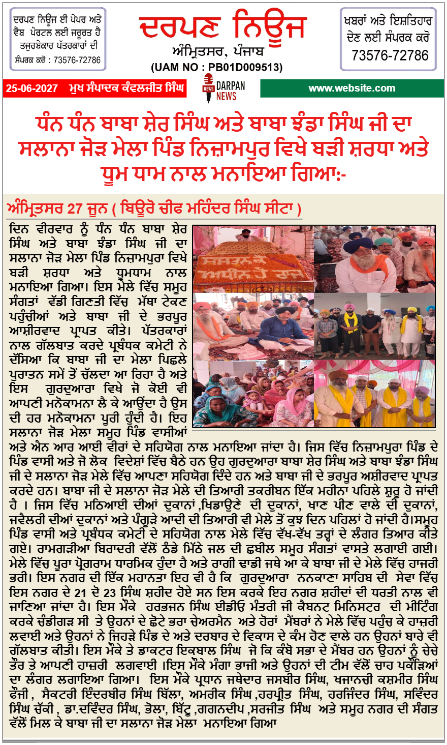Home/State/Punjab/Amritsar/ਧੰਨ ਧੰਨ ਬਾਬਾ ਸ਼ੇਰ ਸਿੰਘ ਅਤੇ ਬਾਬਾ ਝੰਡਾ ਸਿੰਘ ਜੀ ਦਾ ਸਲਾਨਾ ਜੋੜ ਮੇਲਾ ਪਿੰਡ ਨਿਜ਼ਾਮਪੁਰ ਵਿਖੇ ਬੜੀ ਸ਼ਰਧਾ ਅਤੇ ਧੂਮ ਧਾਮ ਨਾਲ ਮਨਾਇਆ ਗਿਆ:- Breaking NewsE-Paper ਧੰਨ ਧੰਨ ਬਾਬਾ ਸ਼ੇਰ ਸਿੰਘ ਅਤੇ ਬਾਬਾ ਝੰਡਾ ਸਿੰਘ ਜੀ ਦਾ ਸਲਾਨਾ ਜੋੜ ਮੇਲਾ ਪਿੰਡ ਨਿਜ਼ਾਮਪੁਰ ਵਿਖੇ ਬੜੀ ਸ਼ਰਧਾ ਅਤੇ ਧੂਮ ਧਾਮ ਨਾਲ ਮਨਾਇਆ ਗਿਆ:- Kanwaljit SinghJune 27, 2025 15 Less than a minute Kanwaljit SinghJune 27, 2025 15 Less than a minute Facebook Twitter LinkedIn Tumblr Pinterest Reddit VKontakte Share via Email Print