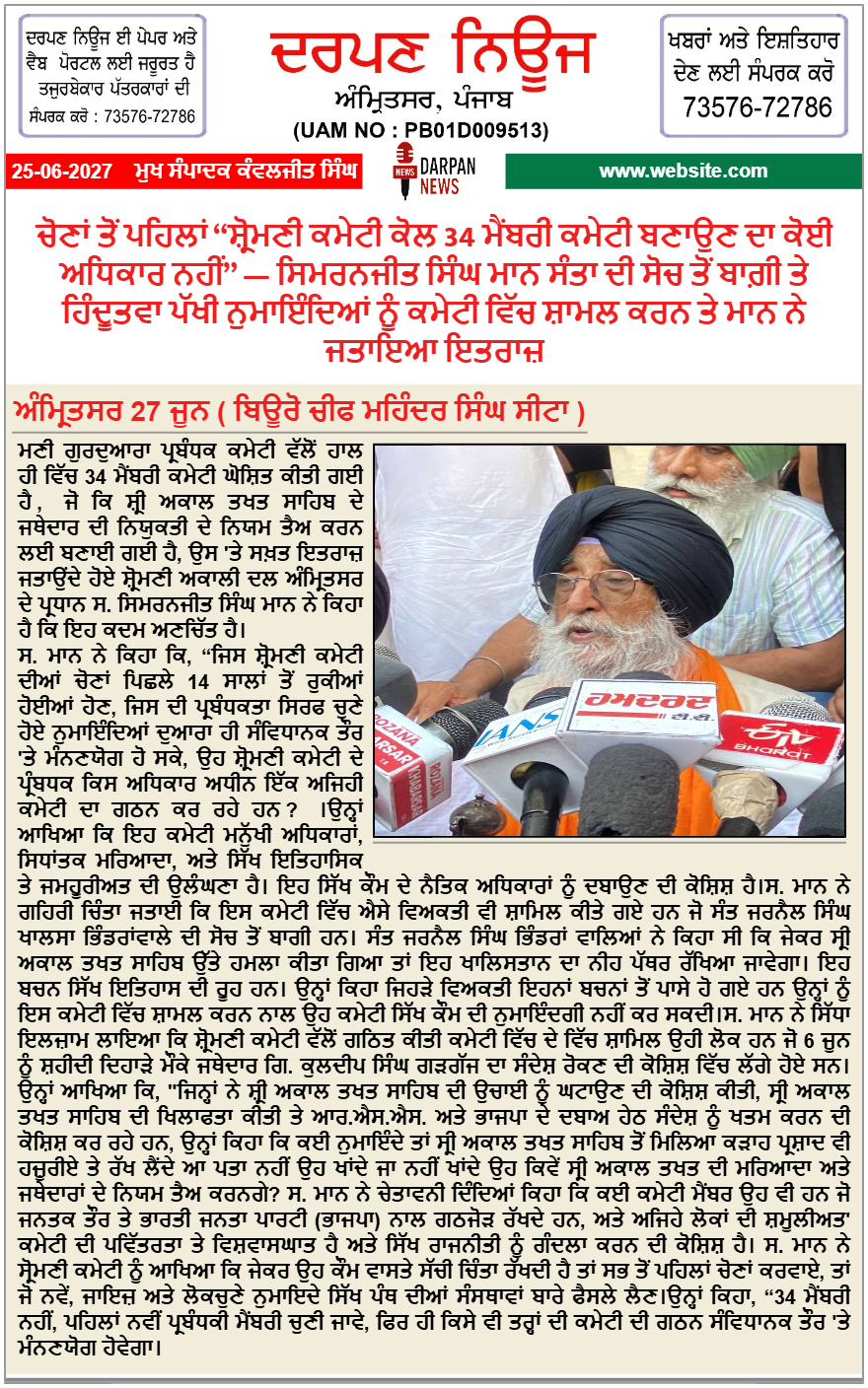 Home/State/Punjab/Amritsar/ਚੋਣਾਂ ਤੋਂ ਪਹਿਲਾਂ “ਸ਼੍ਰੋਮਣੀ ਕਮੇਟੀ ਕੋਲ 34 ਮੈਂਬਰੀ ਕਮੇਟੀ ਬਣਾਉਣ ਦਾ ਕੋਈ ਅਧਿਕਾਰ ਨਹੀਂ” — ਸਿਮਰਨਜੀਤ ਸਿੰਘ ਮਾਨ Breaking NewsE-Paper Trending ਚੋਣਾਂ ਤੋਂ ਪਹਿਲਾਂ “ਸ਼੍ਰੋਮਣੀ ਕਮੇਟੀ ਕੋਲ 34 ਮੈਂਬਰੀ ਕਮੇਟੀ ਬਣਾਉਣ ਦਾ ਕੋਈ ਅਧਿਕਾਰ ਨਹੀਂ” — ਸਿਮਰਨਜੀਤ ਸਿੰਘ ਮਾਨ ਸੰਤਾ ਦੀ ਸੋਚ ਤੋਂ ਬਾਗ਼ੀ ਤੇ ਹਿੰਦੂਤਵਾ ਪੱਖੀ ਨੁਮਾਇੰਦਿਆਂ ਨੂੰ ਕਮੇਟੀ ਵਿੱਚ ਸ਼ਾਮਲ ਕਰਨ ਤੇ ਮਾਨ ਨੇ ਜਤਾਇਆ ਇਤਰਾਜ਼ Kanwaljit SinghJune 27, 2025 31 Less than a minute Kanwaljit SinghJune 27, 2025 31 Less than a minute Facebook Twitter LinkedIn Tumblr Pinterest Reddit VKontakte Share via Email Print