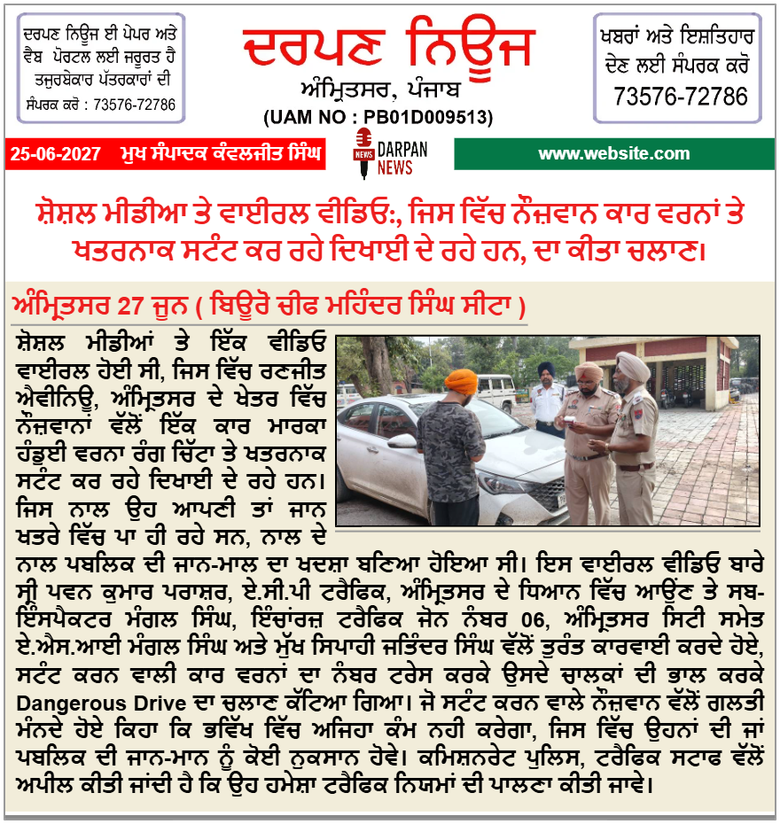 Home/State/Punjab/Amritsar/ਸ਼ੋਸ਼ਲ ਮੀਡੀਆ ਤੇ ਵਾਈਰਲ ਵੀਡਿਓ:, ਜਿਸ ਵਿੱਚ ਨੌਜ਼ਵਾਨ ਕਾਰ ਵਰਨਾਂ ਤੇ ਖਤਰਨਾਕ ਸਟੰਟ ਕਰ ਰਹੇ ਦਿਖਾਈ ਦੇ ਰਹੇ ਹਨ, ਦਾ ਕੀਤਾ ਚਲਾਣ। Breaking NewsE-Paper Trending ਸ਼ੋਸ਼ਲ ਮੀਡੀਆ ਤੇ ਵਾਈਰਲ ਵੀਡਿਓ:, ਜਿਸ ਵਿੱਚ ਨੌਜ਼ਵਾਨ ਕਾਰ ਵਰਨਾਂ ਤੇ ਖਤਰਨਾਕ ਸਟੰਟ ਕਰ ਰਹੇ ਦਿਖਾਈ ਦੇ ਰਹੇ ਹਨ, ਦਾ ਕੀਤਾ ਚਲਾਣ। Kanwaljit SinghJune 27, 2025 30 Less than a minute Kanwaljit SinghJune 27, 2025 30 Less than a minute Facebook Twitter LinkedIn Tumblr Pinterest Reddit VKontakte Share via Email Print