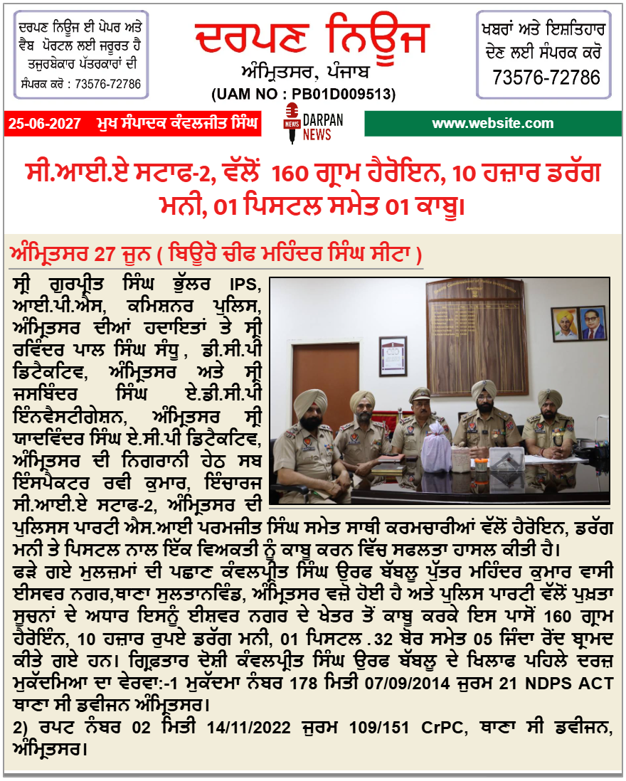 Home/State/Punjab/Amritsar/ਸੀ.ਆਈ.ਏ ਸਟਾਫ-2, ਵੱਲੋਂ 160 ਗ੍ਰਾਮ ਹੈਰੋਇਨ, 10 ਹਜ਼ਾਰ ਡਰੱਗ ਮਨੀ, 01 ਪਿਸਟਲ ਸਮੇਤ 01 ਕਾਬੂ। Breaking NewsE-Paper Trending ਸੀ.ਆਈ.ਏ ਸਟਾਫ-2, ਵੱਲੋਂ 160 ਗ੍ਰਾਮ ਹੈਰੋਇਨ, 10 ਹਜ਼ਾਰ ਡਰੱਗ ਮਨੀ, 01 ਪਿਸਟਲ ਸਮੇਤ 01 ਕਾਬੂ। Kanwaljit SinghJune 27, 2025 32 Less than a minute Kanwaljit SinghJune 27, 2025 32 Less than a minute Facebook Twitter LinkedIn Tumblr Pinterest Reddit VKontakte Share via Email Print