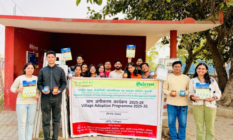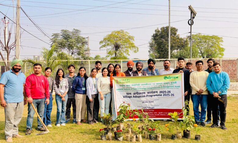 As part of the ongoing Village Adoption Program, the National Institute of Food Technology Entrepreneurship and Management, Kundli (NIFTEM-K), conducted two key initiatives in the village today— a plantation drive and an awareness session focused on NIFTEM’s academic offerings, technology transfer facilities, and innovative food products.