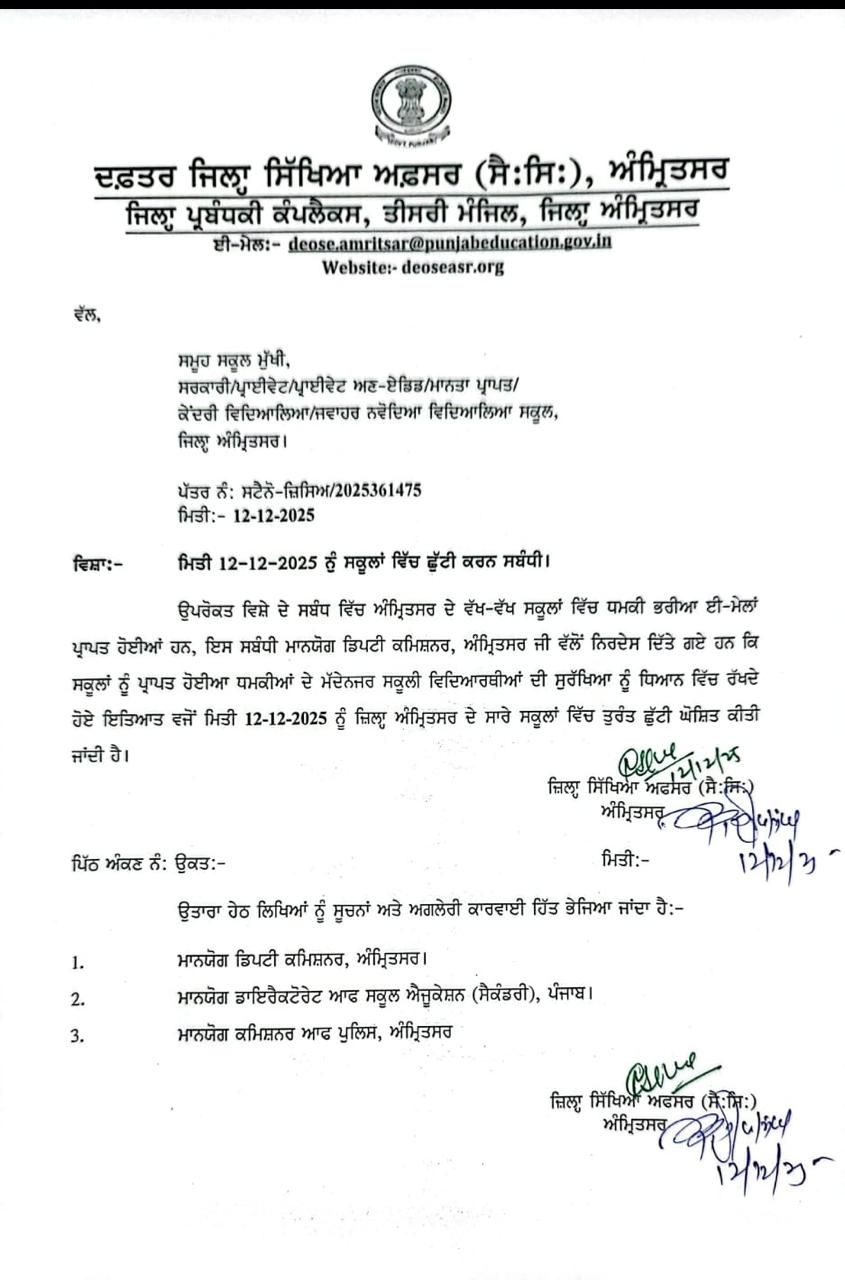ਇਸ ਸੰਬੰਧੀ ਦੱਸਿਆ ਗਿਆ ਕਿ ਅੰਮ੍ਰਿਤਸਰ ਦੇ ਵੱਖ-ਵੱਖ ਸਕੂਲਾਂ ਵਿੱਚ ਧਮਕੀ ਭਰੀਆਂ ਈ–ਮੇਲਾਂ ਪ੍ਰਾਪਤ ਹੋਣ ਤੋਂ ਬਾਅਦ ਤੁਰੰਤ ਸਾਵਧਾਨੀ ਕਦਮ ਚੁੱਕਦਿਆਂ ਸਕੂਲਾਂ ਨੂੰ ਅੱਜ ਲਈ ਬੰਦ ਰੱਖਣ ਦੇ ਹੁਕਮ ਜਾਰੀ ਕੀਤੇ ਗਏ ਹਨ।