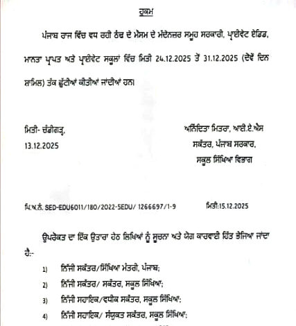 ਪੰਜਾਬ ਸਰਕਾਰ ਦੇ ਸਕੂਲ ਸਿੱਖਿਆ ਵਿਭਾਗ ਵੱਲੋਂ ਜਾਰੀ ਹੁਕਮਾਂ ਅਨੁਸਾਰ ਪੰਜਾਬ ਰਾਜ ਵਿੱਚ ਸਰਕਾਰੀ ਸਕੂਲਾਂ ਵਿੱਚ ਛੁੱਟੀਆਂ ਦਾ ਐਲਾਨ ਕੀਤਾ ਗਿਆ ਹੈ। ਜਾਰੀ ਨੋਟੀਫਿਕੇਸ਼ਨ ਮੁਤਾਬਕ ਮਾਨਤਾ ਪ੍ਰਾਪਤ ਅਤੇ ਪ੍ਰਾਈਵੇਟ ਸਕੂਲਾਂ ਵਿੱਚ 24 ਦਸੰਬਰ 2025 ਤੋਂ 31 ਦਸੰਬਰ 2025 ਤੱਕ ਛੁੱਟੀਆਂ ਰਹਿਣਗੀਆਂ।